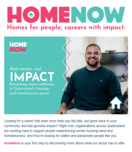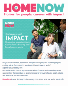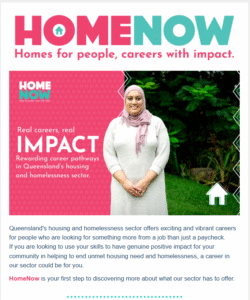 The HomeNow newsletter included news from Queensland’s homelessness and housing sector, stories from real people working in the sector, role profiles, job vacancies, training opportunities and information on leading organisations and employers.